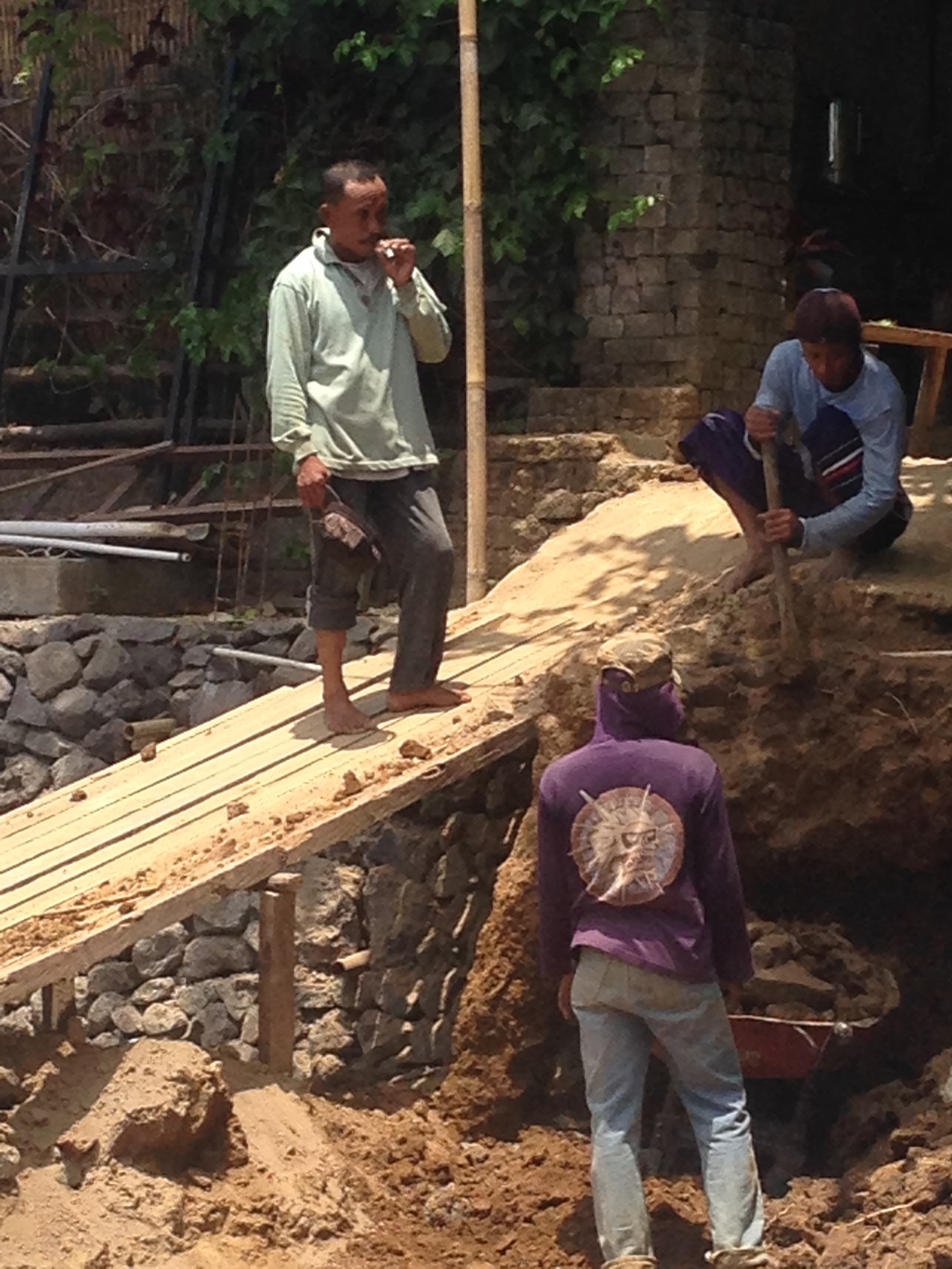 What is also very typical for Bali are 60 year old + women working construction under a warm sun and unforgiving weight on their heads. Their job is to take the rocks, placing them in a basket and carrying them on their heads or into wheel barrows to dispose of them down the street. Their work attire is a layered dress with a sarong and slippahs (flip flops.)