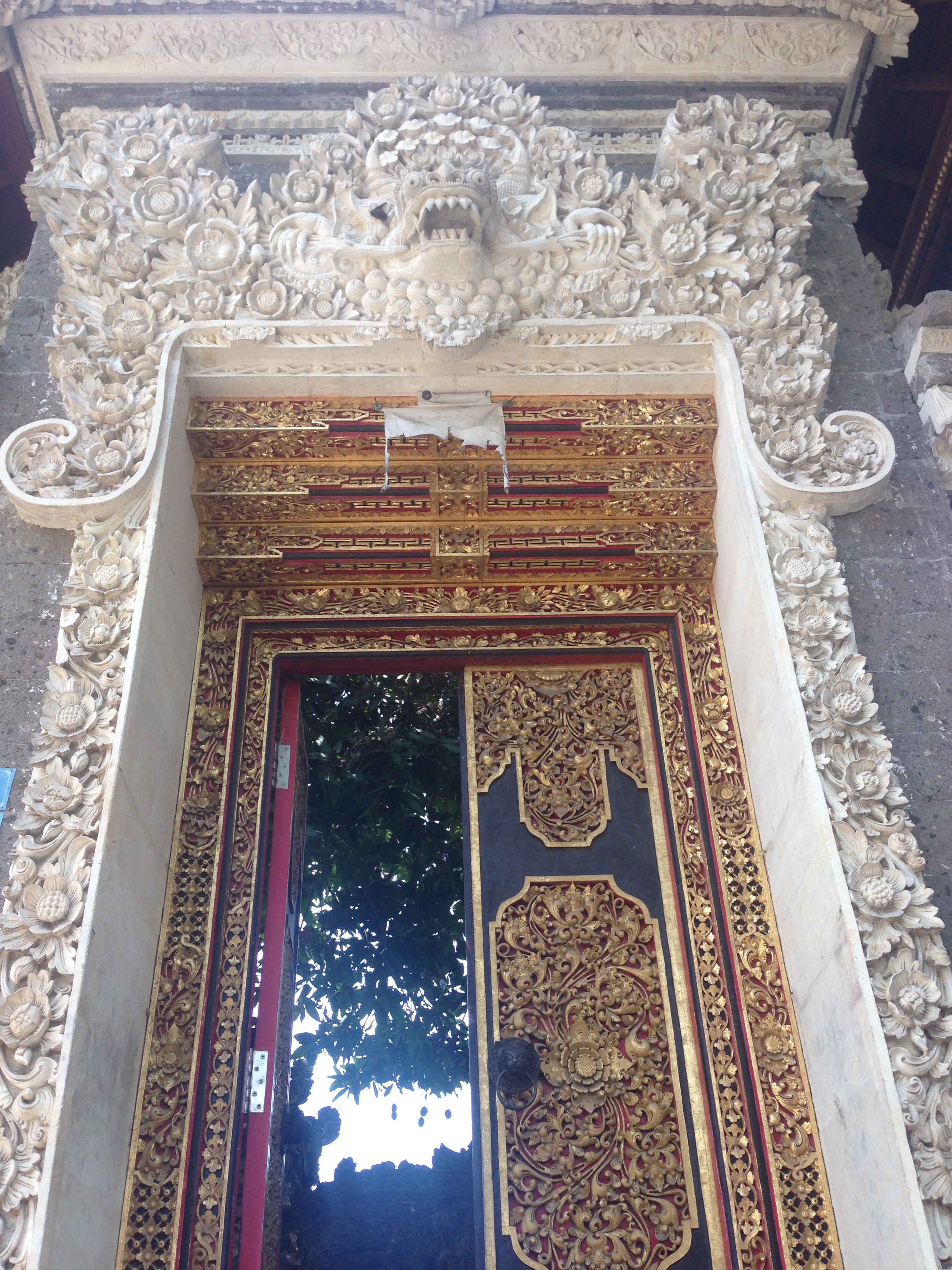 I take the same walk into town each day, but today with new eyes. I take the narrow concrete path through the bright and massive rice paddies, the only real sound with no one around is the wind blowing through the tall grass that surrounds you. Calm. The hand-carved elaborate doorway structures that give a very opposite message from the tall concrete walls boarding in the houses and their hand-attended gardens.